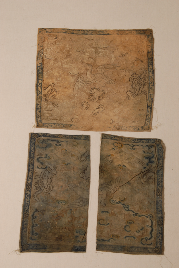描述:此套补子共有三块,其中两块为前补,一块为后补,以缂丝的技法织成,为云雁图案,是清代四品文官的补子。