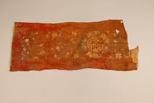 描述:该件织物为一被套,被面使用大红色花卉纹暗花绸制成,以1/1平纹为地,3/1右斜纹组织起花,褪色严重,被里则用红色素绢制成。被面以彩色丝线刺绣,但绣线大多褪色,现可辨的有绿、棕、红等几色。被面的刺绣图案直径为38cm 的“五福捧寿”和几枝玉兰等花卉纹样构成。