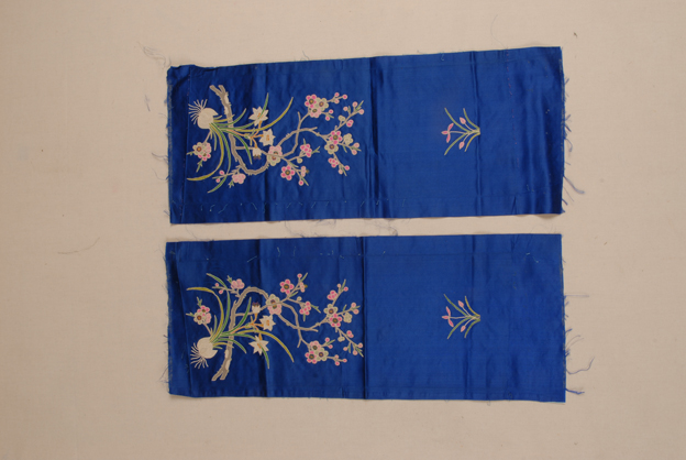 描述:该袖头共两件,保存情况较好,均以宝蓝色八枚素缎织物为绣地,其上以打籽的刺绣技法绣出整枝水仙花纹样,针法细腻。