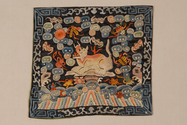 描述:此为戏补,藕荷色缎地,盘金绣有仙鹤、日、云、蝙蝠、花卉、水纹。图案简捷生动,线条流畅明快。