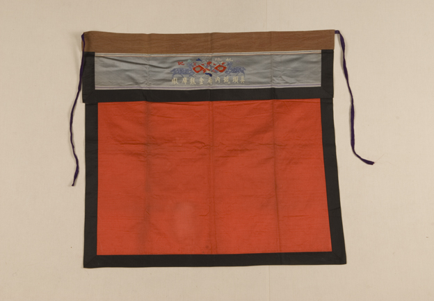 描述:该织物为一桌围,面料采用大红色素缎。桌围镶有机头,织有“真头号内局金银库缎”。桌围上端两侧缀有系带一根。