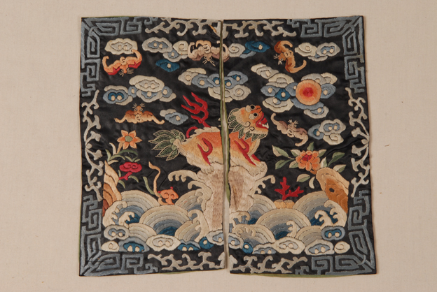 描述:此方补为清代武二品补的前片,蓝缎地上绣有狮子、海水江崖、云、花卉、日、蝠等纹样,回纹卷草边饰。补子整体以三蓝绣为主,彩绣狮子、蝠纹等,色彩上十分有层次,且绣工精致。
