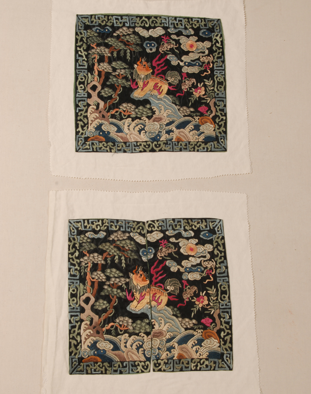 描述:清代的补子贝子以上皇亲贵族用圆补,以下用方补。此为武官四品官服上的补子,面料色用石青,绣有回纹卷草边饰,主题纹样为下方海水江崖,中间虎纹,右上方彩云捧日,间有松枝、花卉、万字、灵芝、蝙蝠等纹样。