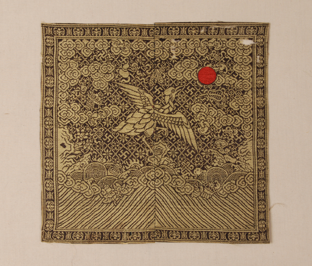 描述:方补,属于补子的一种,又称“胸背”,明清时期用来体现官位品级。该方补为织锦鸂鶒方补,为前补,属于文官七品。
