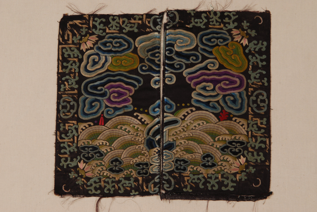 描述:此方补为补子的前片,蓝缎地上彩绣海水云纹,中间有空出,此补为一空补,如是绣日,则彩云捧日为清代从耕农官的补子。