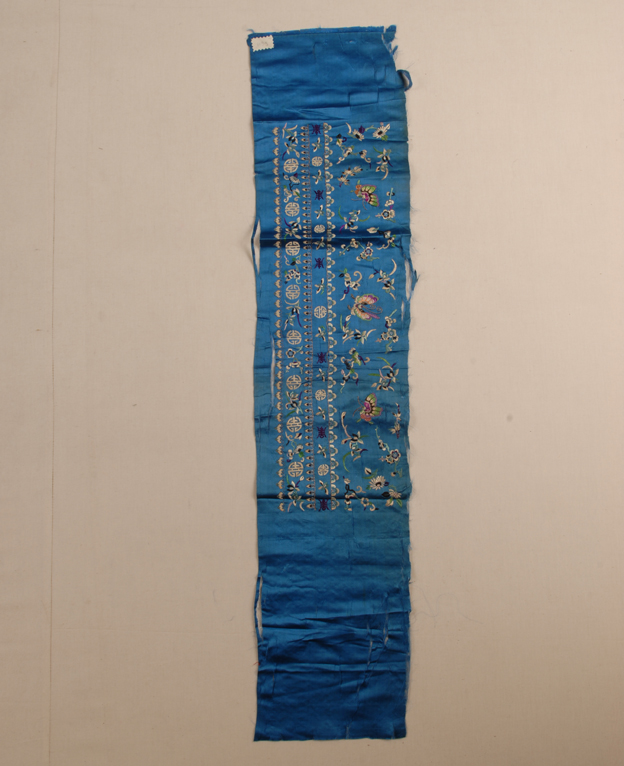 描述:该套袖头只有一块并有多处已裂开,以蓝色八枚素缎织物为绣地,其上用彩色丝线及捻金线以戗针、钉金、扎针等刺绣技法在三个条形图案区中绣出花卉、蝴蝶、寿字等纹样,针法细腻,配色典雅。