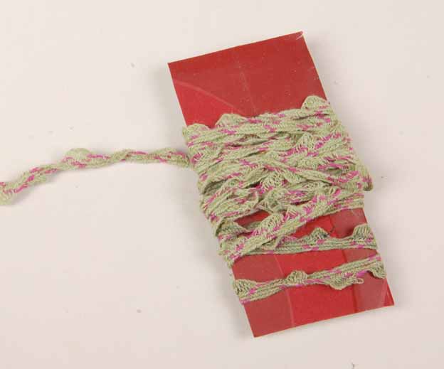 花边又称“绦子”或“阑干”,用来围饰在帷幕、桌围、椅披或床沿等家用纺织品的边缘。该花边主要由绿色丝线织成,中间穿插粉红色丝线,极细,一边有连续的突起,表面平整,无花纹。