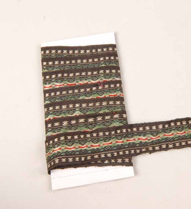 花边又称“绦子”或“阑干”,是帷幕、桌围、椅披或床沿等室内家纺用品上的重要装饰品;清末民初时候,花边又被用来镶滚在衣服领口、袖口或裙子下摆的边缘等地方,既加强了衣服得装饰效果,增加了衣服的牢度,又增添了装饰效果。该花边图案排列整齐,褐色为地,中间饰以由绿色、红色、白色等三种丝线织成连续的几何纹样,两边并有白色的树状纹做边饰。