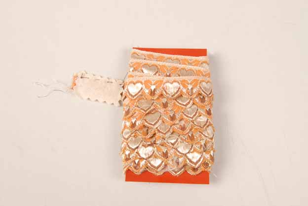 该花边以粉色为地,织以白色的心形纹和三瓣花为单元的二方连续纹样。主要用来镶滚衣服或裙子的边缘,多用于领口、袖端、襟边及下摆。既增加衣服了的牢度,又增添了衣服得装饰效果。