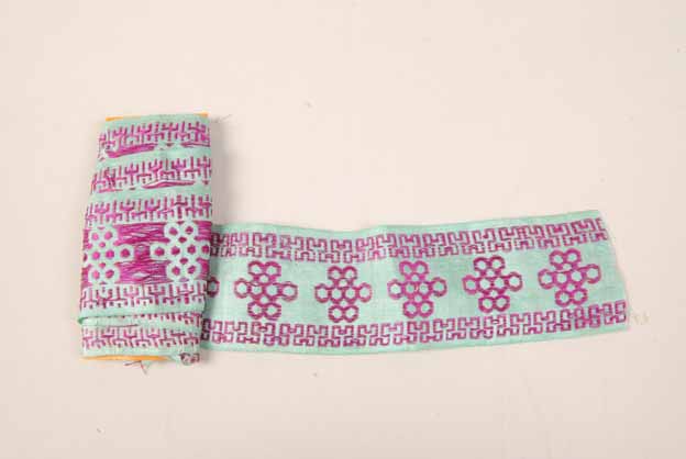 该花边图案安排整齐,以浅绿色为地,两端织以粉色的齿轮状纹样,中间饰以连续的盘长纹样。花边又称“绦子”或“阑干”,是帷幕、桌围、椅披或床沿等室内家纺用品上的重要装饰品;清末民初时候,花边又被用来镶滚在衣服领口、袖口或裙子下摆的边缘等地方,既加强了衣服得装饰效果,又增加了衣服的牢度。