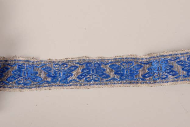 该花边质地稀松,白色为地,中间饰以蓝色蝴蝶纹为单元得二方连续纹样。主要的是用来镶滚衣服或裙子的边缘,多用于领口、袖端、襟边及下摆。既增加衣服的牢度,又增添了装饰效果。