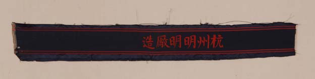 该机头上黑底,其上有红色“杭州明明厂造”织款,对研究杭州民国时期丝织业状况及丰富我馆杭州民国丝织产品具有现实意义。