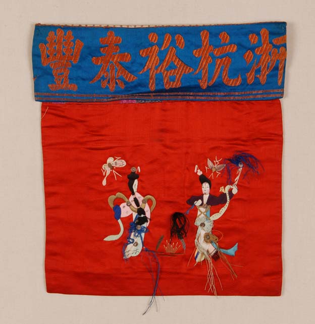 绣片上方为织物机头,有“浙杭裕泰丰” 织款,下方为红色缎地贴绣,纹样为两位女子在嬉戏,一位正面,一位背面,伴有飞舞的蝴蝶,并留有丝穗。