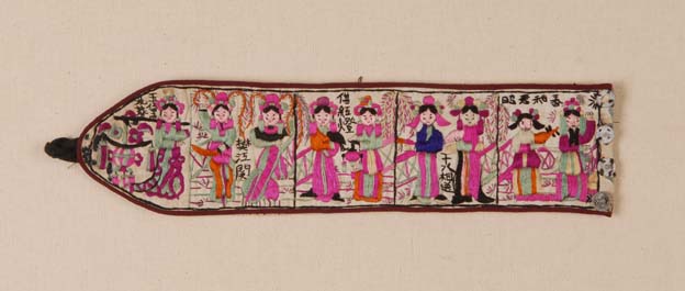 该刺绣小件,是旧时嘉兴秀州区一带的农村妇女用来装饰围裙(当地称之为“围腰”)的手工艺品。这件绣品绣了五个戏曲故事,从右到左分别是“昭君和番”,“十八相送”,“借红灯”,“梵江关”和“黛玉葬花”。绣品的图案朴实、稚拙,处处洋溢着浓郁的乡土生活气息。