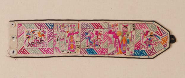 该刺绣小件,是旧时嘉兴秀州区一带的农村妇女用来装饰围裙(当地称之为“围腰”)的手工艺品。这件绣品从右至左分成了五个部分,其中第一、三、五部分在万字不断头的底纹上绣有鹊上枝头的纹样;二和四部分绣了两个戏曲故事,分别是“凤仪亭”和“樊梨苍”。绣品的图案朴实、稚拙,处处洋溢着浓郁的乡土生活气息。