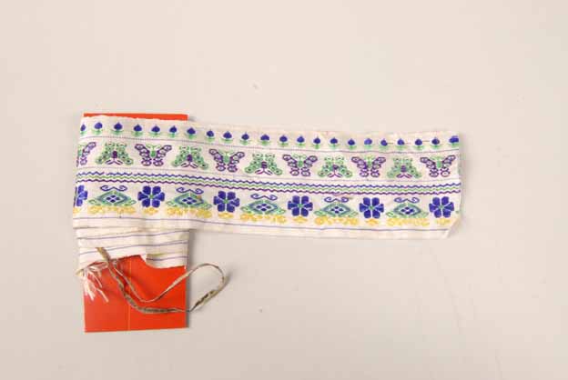 花边又称“绦子”或“阑干”,除一部分作为帷幕、桌围、椅披或床沿等边饰外,更主要的是用来镶滚衣服或裙子的边缘,多用于领口、袖端、襟边及下摆。花边最初的用途是为了增加衣服的牢度,后来在实用的基础上,又增添了装饰效果。该花边图案安排整齐,分上中下三层,上端为循环连续的小树状纹,中间呈S状循环连续的蝴蝶纹,下端饰以六瓣花卉、蝴蝶纹为单元的二方连续纹样,纹样颜色由蓝、绿等色组成。