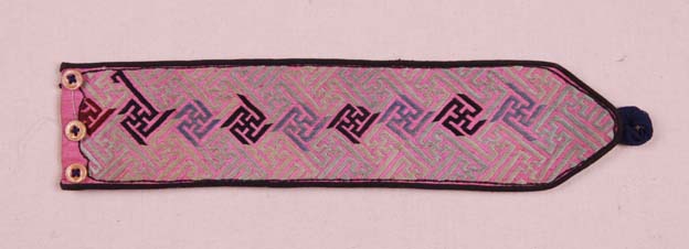 旧时嘉兴秀洲区一带的农村妇女喜欢用刺绣装饰围裙,当地称之为“围腰”。该围腰小件刺绣,在红色地上用蓝黑等多色丝线绣卍字纹,这种卍字纹被称为“万字不断头”,常被寓意绵延万代。绣品短针细密,针脚平齐,片线光亮。绣品周围镶有黑色丝线,一边还钉有三颗塑料纽扣。