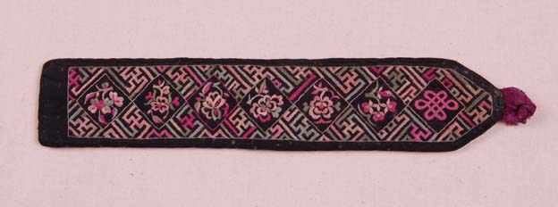 旧时嘉兴秀洲区一带的农村妇女喜欢用刺绣装饰围裙,当地称之为“围腰”。该围腰小件刺绣,在黑色地上绣卍字底纹,这种卍字纹被称为“万字不断头”,常被寓意绵延万代。并在绣品中间绣六幅花卉纹,一幅盘绦纹。绣品短针细密,针脚平齐,片线光亮。