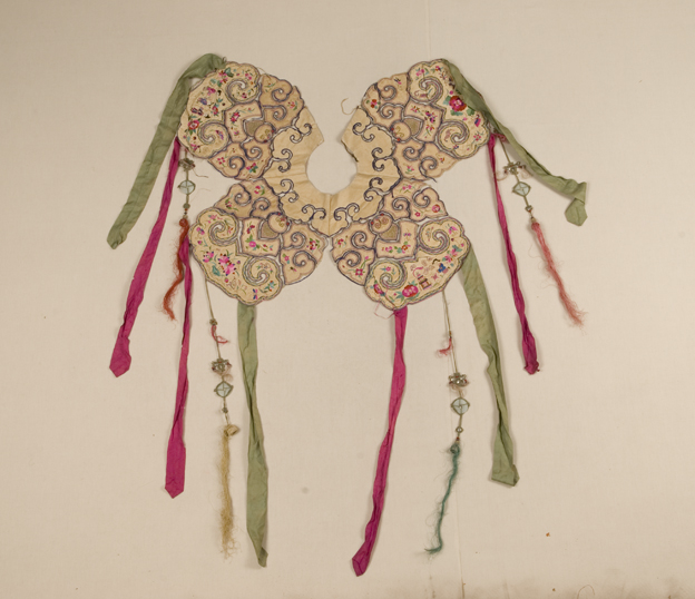描述:该件织物是清代妇女常用的服饰品——云肩,保存完好,以白色八枚缎织物为底,以彩色丝线及捻金线绣出花蝶人物纹样,该件云肩如意头四出,为典型的四合如意式云肩。此外,该云肩还缝有八条分别用桃红色、绿色暗花绸制成的飘带及四条的以中国结制成的饰带。