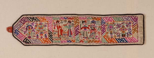 该刺绣小件,是旧时嘉兴秀州区一带的农村妇女用来装饰围裙(当地称之为“围腰”)的手工艺品。这件绣品的底部是万字不断头的底纹,绣品左右绣有两幅花卉纹;中间部分绣了两个戏曲故事,分别是“冰盘进荔”和“薛丁山”。绣品的图案朴实、稚拙,处处洋溢着浓郁的乡土生活气息。