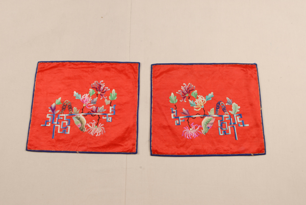 描述:该件绣品共有两片,是典型的汴绣,绣品均以大红色八枚素缎为底,以蓝色素缎包边,其上以彩色丝线绣出一鹦鹉架,其上伫立一绿羽鹦鹉,四周则围绕着菊花图案,在色彩的使用上具有明显的晕色效果,当是刺绣完成后,在绣线上用色点染而成。