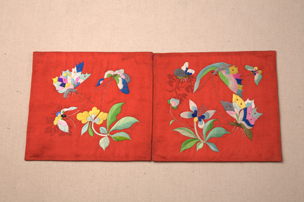 描述:该枕顶共有两片,保存完好,均以大红色素缎做主要面料,其上以彩色丝线绣出蝴蝶及花卉纹样,配色鲜艳。