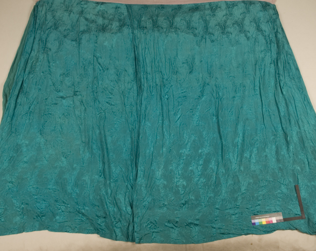 描述:此件为床帐,呈立方体状,主体面料使用绿色花卉纹绸,其基本组织为1/1平纹地上以经浮长起花,衬里使用绿色平纹织物,织物粗犷,可能是茧绸一类的织物。帐顶和边沿使用粉白两色的格子纹棉布制成。
