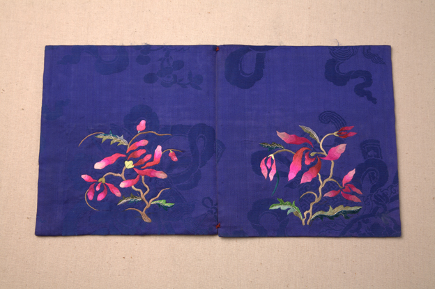 描述:该枕顶共有两片,保存完好,均以宝蓝色暗花缎做主要面料,其上以彩色丝线绣出花卉纹样。