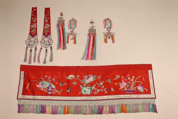 描述:该套织物包括一个帐沿,两根飘带。帐沿以红色五枚缎织物为底,以彩色丝线绣出三组图案,从左到右分别为围绕于花瓶四周荷花、荷叶、盆栽的牡丹及置于花篮之中的水仙、寿桃等,三组图案间以喜鹊、蝴蝶串连。帐沿下方缝有流苏等装饰品,三边镶有白缎地彩绣花卉纹的花边,另一边拼缝红色棉布。飘带亦以红色五枚缎织物为底,上面以彩线绣出花鸟纹样,其下方为用白色缎做成的如意头,钉以金线勾边,彩绣双钱、蝙蝠、寿桃、佛手、卐字、如意等图案,下缝三组穗子。
