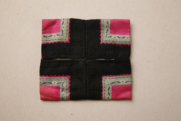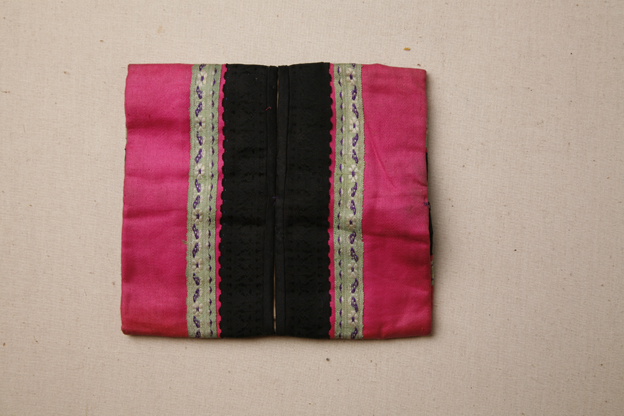 描述:该 暖脚以玫红色素缎为主要面料,中部以黑色素缎和绿地花卉蝴蝶纹镶有两道花边。