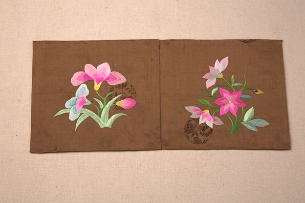 描述:该枕顶共有两片,保存完好,均以棕色暗花缎做主要面料,为团花图案,其上以彩色丝线绣出花卉纹样,花型优美。