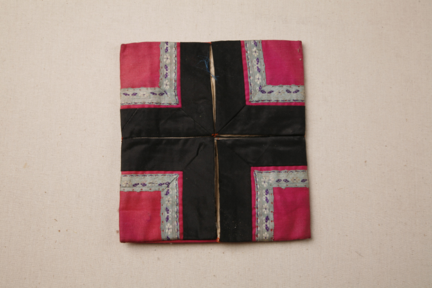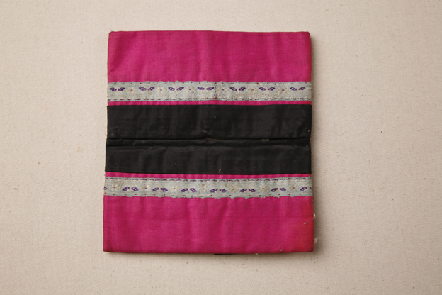 描述:该暖脚以玫红色布为主要面料,中部十字形开口,开口四周镶有黑色素缎和蓝地蝴蝶花卉纹花边装饰。