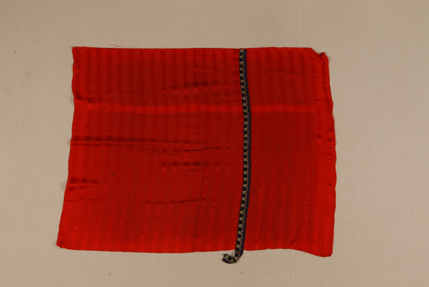 描述:此为一块零料,为暗花绸织物,条纹纹样,其基础组织为1/1平纹地上以四枚经破斜纹组织起花,面料上还缝有一黑地绦带。