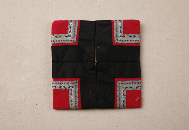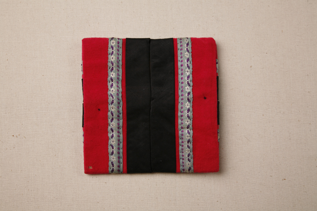 描述:该暖脚以玫红色绒为主要面料,中部十字形开口,开口四周镶有黑色素缎和蓝地蝴蝶花卉纹花边装饰。