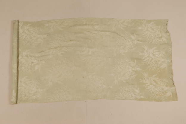 描述:此为一块匹料,浅绿色,保存较为完好,为暗花绸织物,其基本组织为1/1平纹地上以经浮长起花,采用缎纹组织间丝,其图案为整枝的梅竹纹样。