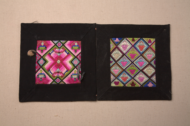 描述:该枕顶共有两片,保存完好,均以白色纱织物做主要面料,其上以彩色丝线用戳纱绣的技法绣出几何花卉纹样,并以黑色素缎镶边。