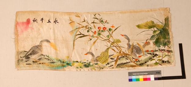 描述:该织锦画,为一幅彩色池塘小景画。有“永立千秋”和“时代锦绣厂出品”字样。此类织锦画,利用彩色丝线通过组织变化,使织物表面显示出与彩色图案一致的风景,是一种供装饰和欣赏用的丝织工艺品。