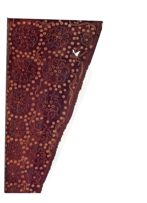 绣片以绢织物作绣地,其上用蓝、米白、褐等色丝线绣出团花及联珠纹样,团花有六瓣、四瓣,并无定式,可见刺绣时较为随意。