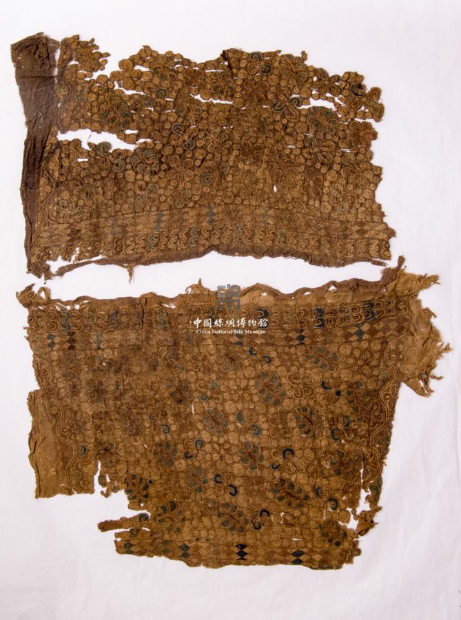 形状内容描述 此件残片共有两块,均以平纹绢做绣地,其上以彩色丝线用锁绣的技法刺绣,其主体图案为以圆点形成的菱格形骨架,在其中填入花卉纹样,花纹分布较满。