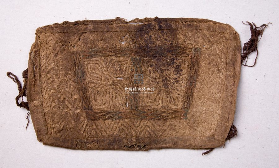形状内容描述 该件绣品以深褐色绢作地,其上用圈绒绣的方法绣出水波纹和两个方格纹,内填四瓣莲花图案。这种绣法较为特殊,以线圈来表现图案,使绣品表面呈现与绒织物相近的效果。