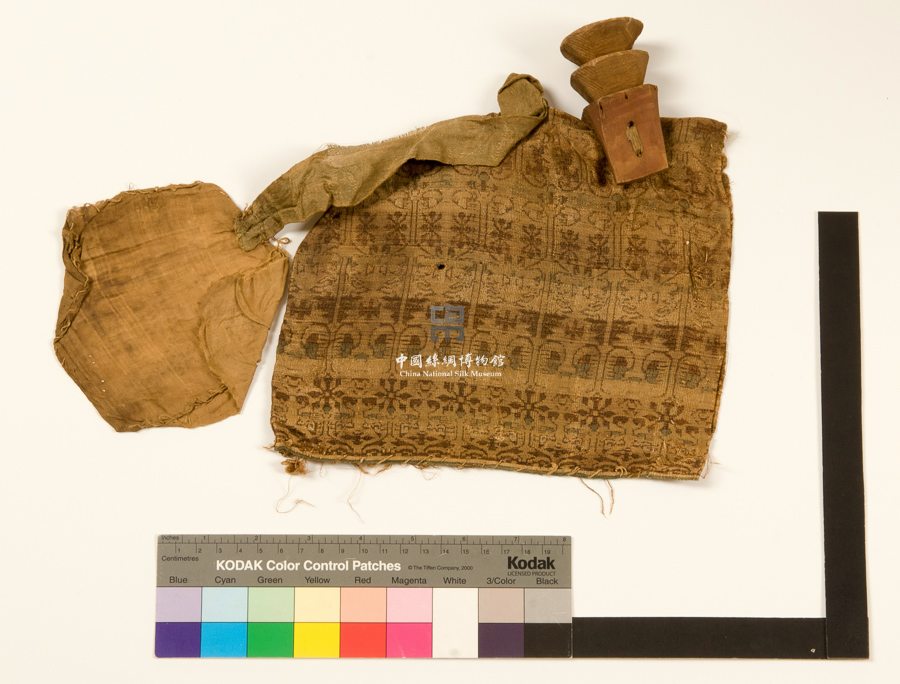 形状内容描述 此帽为风帽的上部分,其最上端装饰三层塔形木制装饰物,装饰物上有若干个小孔,可能为插羽毛之用,其上还有两根帽带,帽的面料组织为三色暗夹纬平纹经锦,帽带组织为平地上显斜纹花的绮和绢。