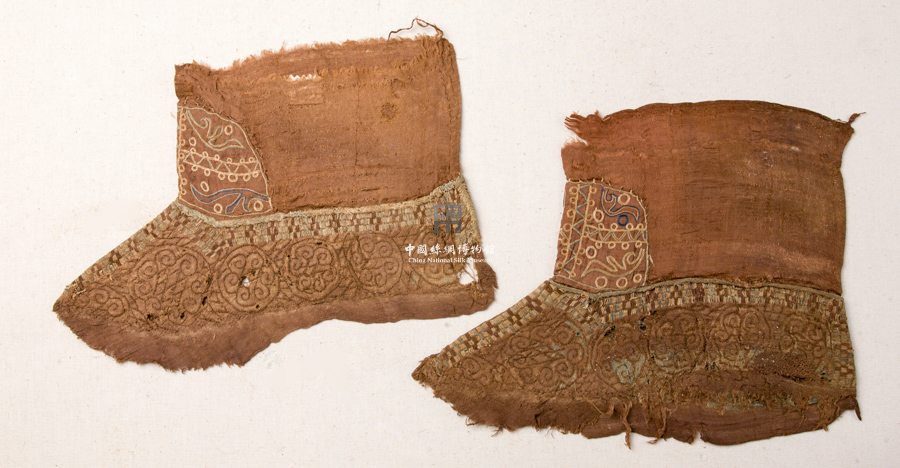 形状内容描述 此绣件可能是一对靴,但缺靴底,由靴筒和靴面两部分组成。靴筒面料为红褐色绫,在正中处上以黄、蓝、绿丝线绣出锯齿纹、圆点等图案,靴面上部边缘装饰有以黄、绿、褐三色的小方格,共有三排。在靴面下部则以与靴面颜色相同的绣线绣出卷草纹。靴子是北朝游牧民族日常用品,此靴绣工精致,风格粗犷,是刺绣日用品的佳作。
