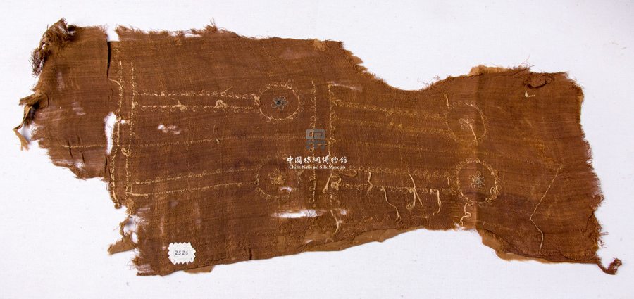 形状内容描述 该件绣片征集自青海民间,略有残破,以平纹绢为地,其上用锁绣的方法刺绣出花卉图案,花为一小团花和两茎杆,非常具有装饰性。