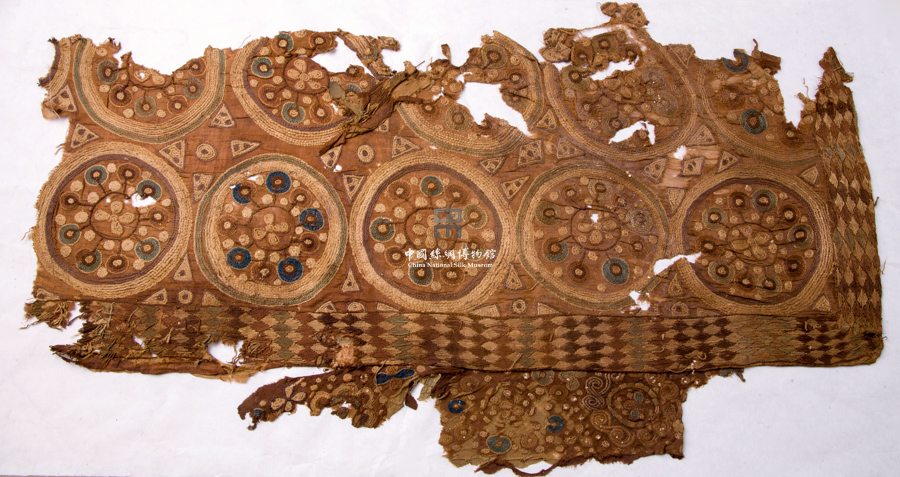 形状内容描述 该件绣片是在红色绢地上以锁绣绣出小团花纹,团窠内是黄色、绿色的圆组成的小花,边缘以平绣绣成。