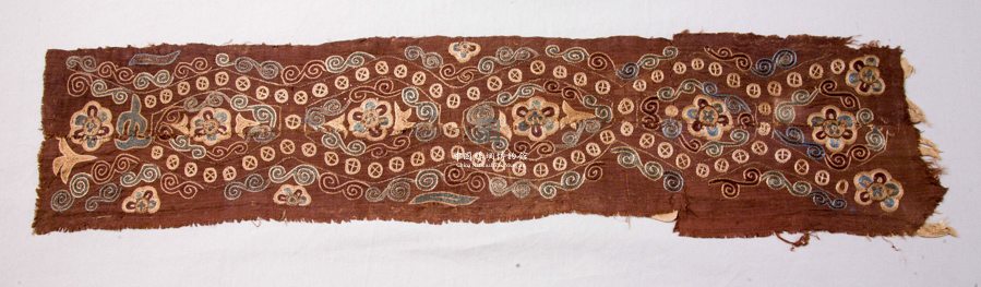 形状内容描述 该件织物褐色绢为地,以彩色丝线用锁绣绣作,图案以交波纹为骨架,交波为十字圆圈,六瓣花居中,外围缠枝卷草,非常精致。
