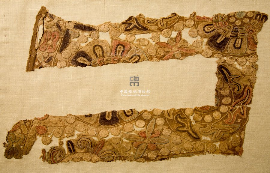 形状内容描述 该件绣品共有两块,以平纹绢为地,其上用锁绣针法绣出图案,图案为满地,分别绣出团窠状的花卉纹样,具有极强的装饰性。该绣品征集自青海民间,较残破。