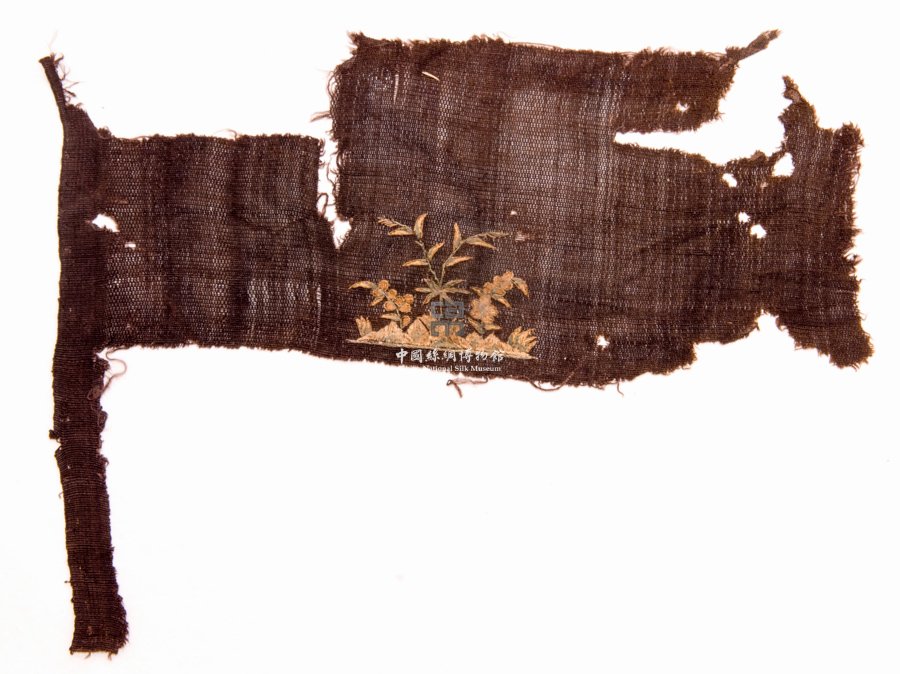形状内容描述 该织物为一罗地花卉纹刺绣。刺绣是一种重要的装饰手段,在辽代纺织品和服装中都被广泛采用。在辽代,钉金绣的针法和彩色丝线的平绣经常在一起使用,其中一种组合是在纹样的轮廓上用钉金绣,而轮廓内又是用平针,此处称为压金彩绣。该绣品就采用了这种绣法。在唐末辽初这种刺绣方法非常受欢迎。在辽墓尤其是在耶律羽之墓中就有大批类似的刺绣品,