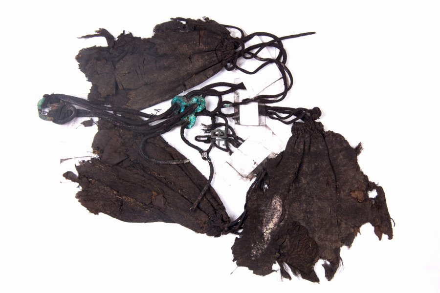 形状内容描述 此为一组荷包,共有三只,现都已残破。荷包均以平纹绢织物为面。其上以绣线采用满绣的方法刺绣,现可辨认的,一为鱼鳞状菱格图案,另一为由四个长菱形组成的几何骨架,绣线以两根丝线以Z捻并合,而荷包内以平纹绢作衬里。荷包口两边各有两根细的编织绳装饰,另有一较粗的系绳。三只荷包的系绳分别穿入铜饰扣内,最后系于一铜环饰上,铜饰均已生有铜绿。