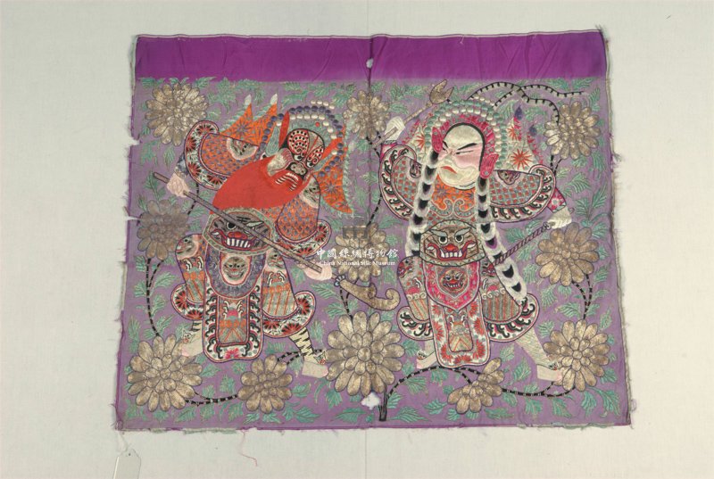 形状内容描述 此块桌围以玫瑰紫色素缎作绣地,略有残破,其上用盘金、压金彩绣、钉绣高绣等各种技法方法绣出两个戏曲人物及花卉纹样,原可能是戏班用品。