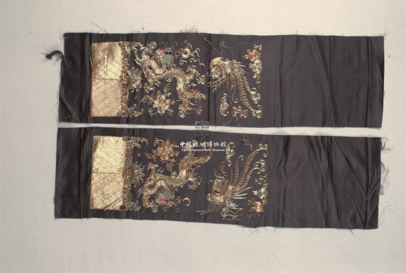 形状内容描述 该套袖头共两件,以褐色八枚缎织物为底,每片上以平金绣的刺绣出龙、凤及江崖海水纹样。绣线除使用捻金线外,在龙头部位还使用了红、绿、白三色的彩色丝线。